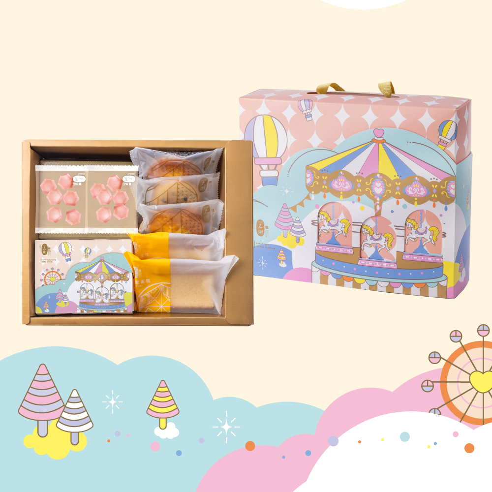 魔法樂園彌月禮盒外盒設計充滿童趣,融入甜蜜小點心,