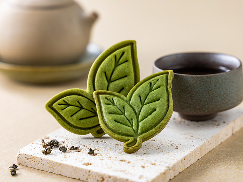 以茶葉造型壓模,細膩展現茶葉脈紋。馳名台灣綠粉入餅,茶香清新