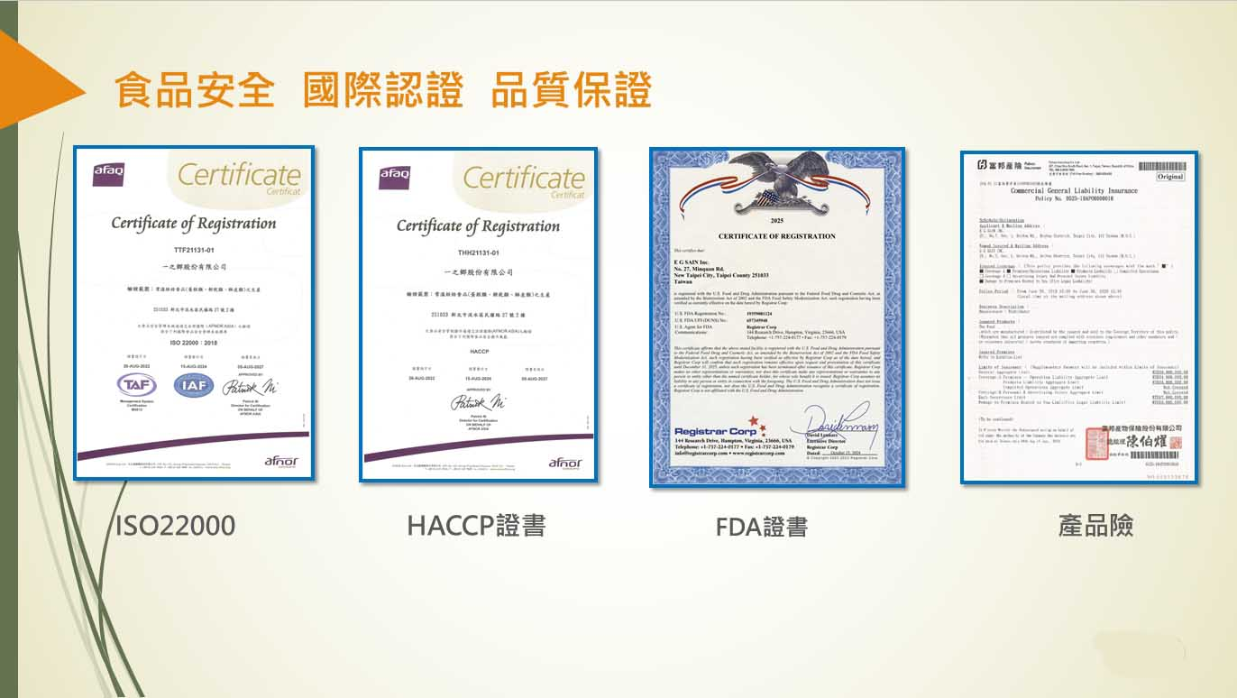 通過 FSSC、ISO 22000、HACCP、FDA 等多項國際食品安全認證,