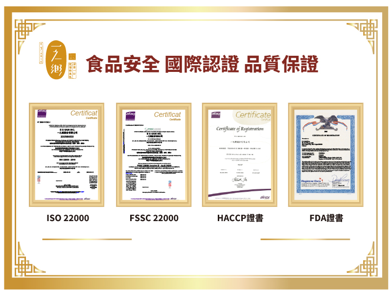 通過 FSSC、ISO 22000、HACCP、FDA 等多項國際食品安全認證,